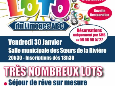 Le Club Partenaire du LABC organise le loto du club 23 Jan 2026Marketing LOTO LIMOGES ABC proposé par le club partenairesPensez à réserver vos places par SMS au 06 08 96 57 27 Vendredi 30 janvier... Lire plus0