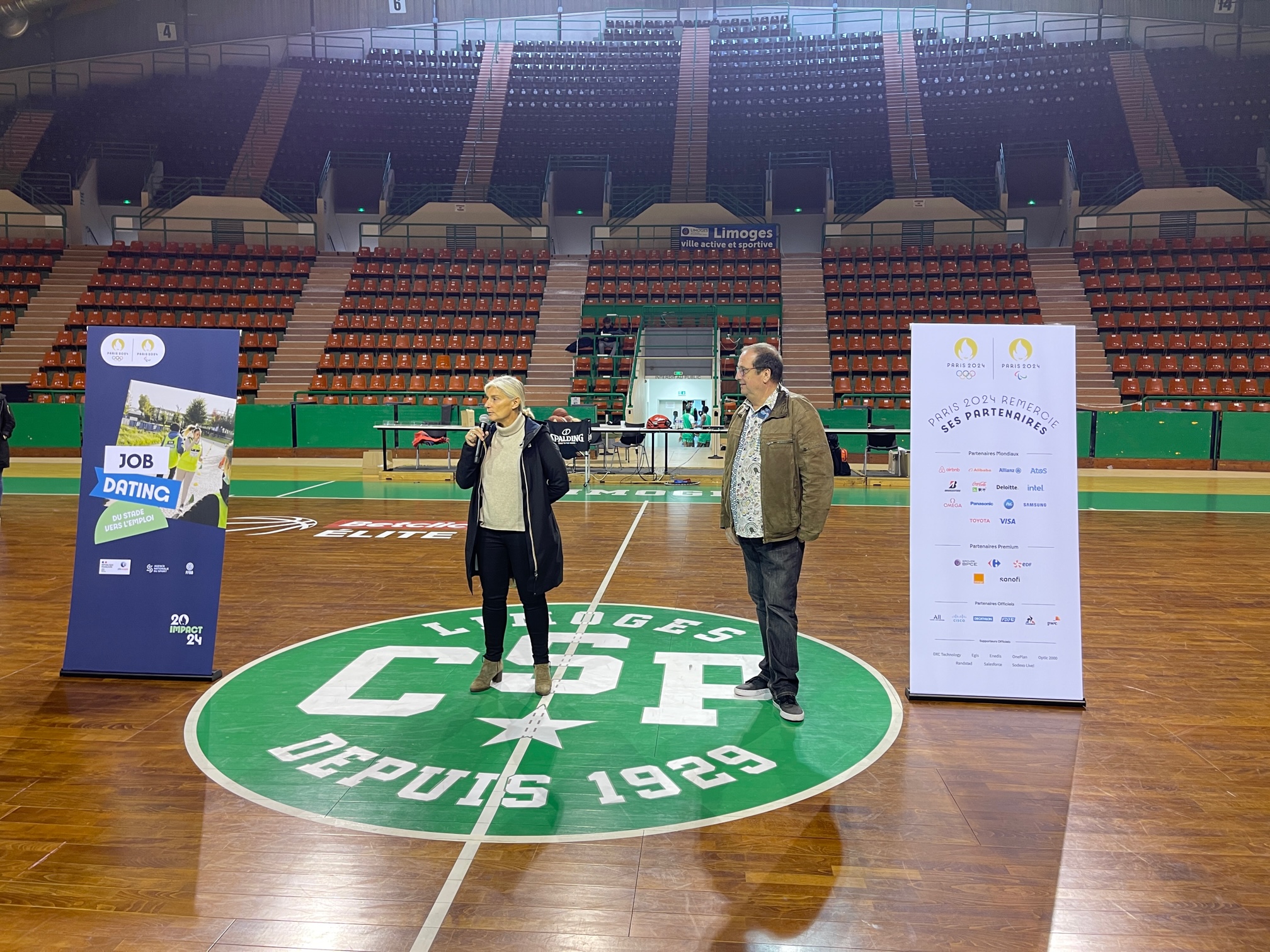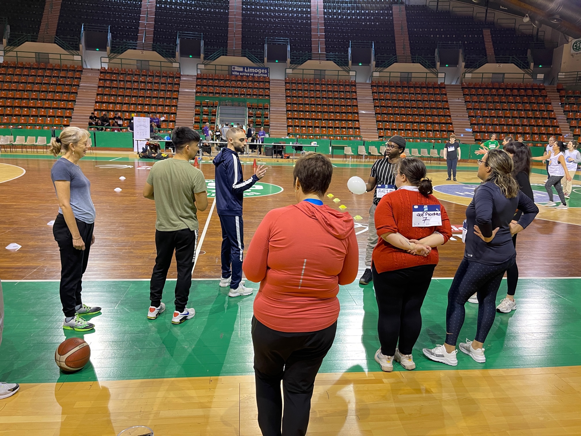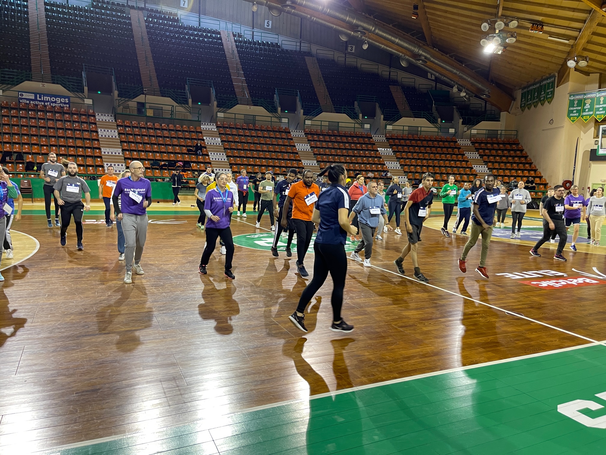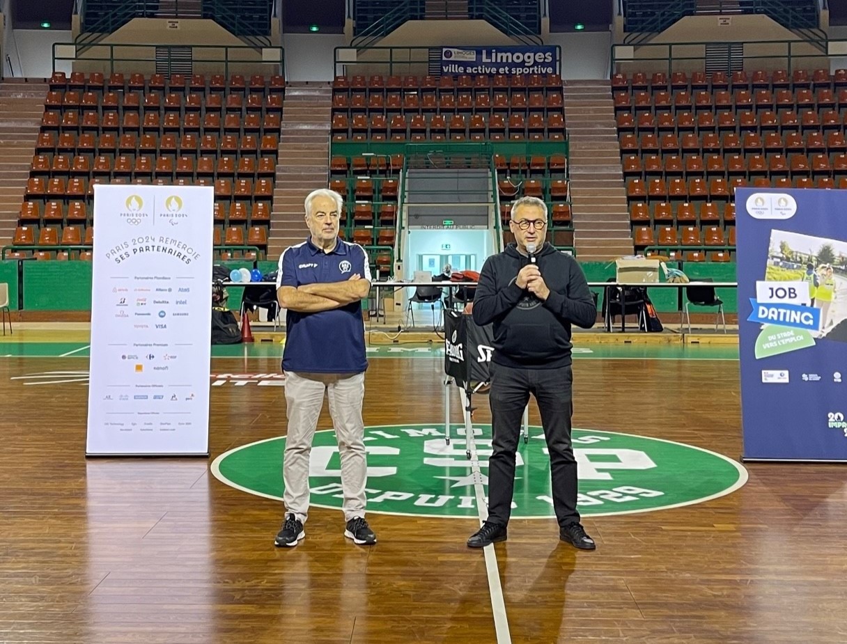 Le Limoges ABC et le Limoges CSP SASP ont co organisé ce vendredi un Job Dating très original, “Du Stade vers l’Emploi” dans l’enceinte du Palais des Sports de Beaublanc. Proposé conjointement par la Fédération Française de BasketBall et par Pôle Emploi, dans le cadre des initiatives autour de Paris 2024, l’évènement a réuni une soixantaine de demandeurs d’emploi qui ont rencontré une douzaine d’employeurs. Mais les rencontres opérationnelles qui se sont déroulées l’après-midi ont été précédé par une mise en bouche très originale et appréciée sous la forme d’une phase d’échauffement en musique avec Lise Leroy puis de sept ateliers (*) le matin de 10h à 12h sur le parquet de Beaublanc. Animés par les coaches du Limoges ABC, ces Ateliers ont été une belle réussite et ont permis à chacun de se connaitre dans des situations atypiques, sur un fauteuil de handibasket ou lors d’un parcours de drible.
