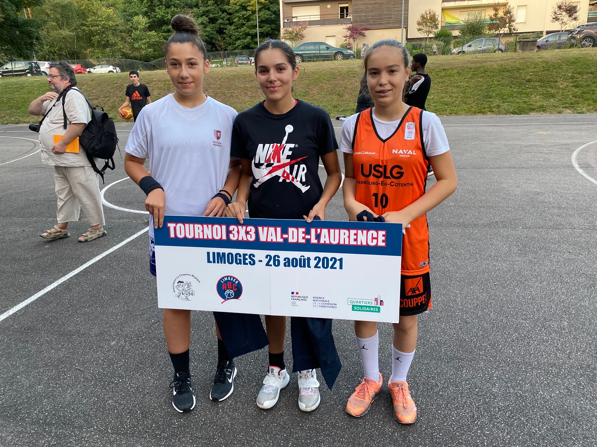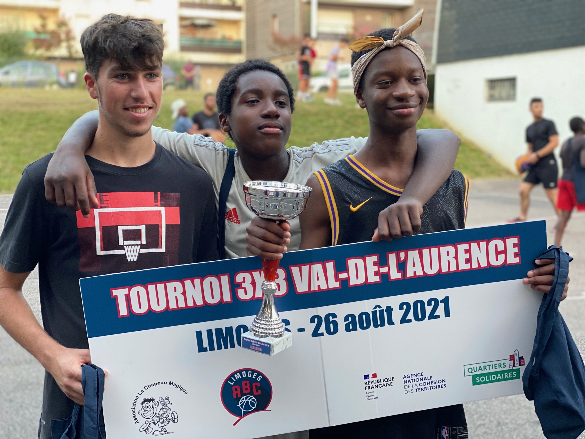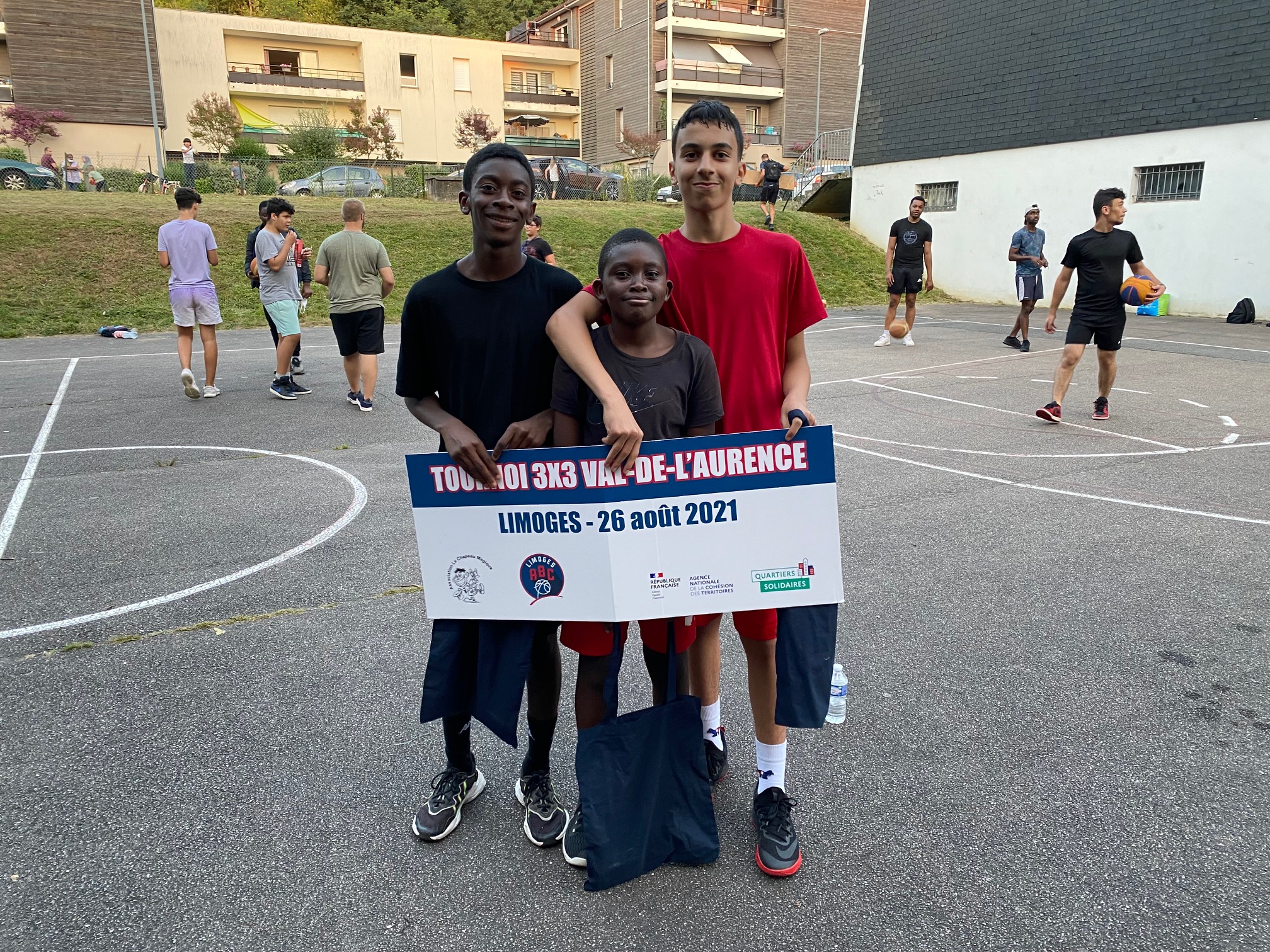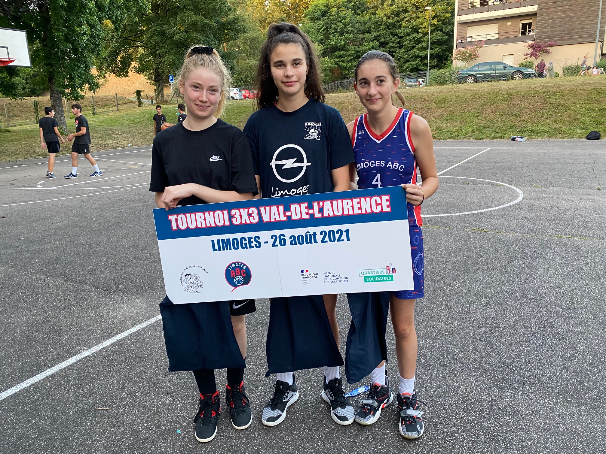 Ce jeudi 26 août, les terrains de Calmette, au Val-de-L’Aurence ont accueilli un beau petit Tournoi 3×3 dans un environnement très sympathique et convivial, musique, basket, défis, jeux, concours. Six équipes de garçons et trois équipes de filles ont répondu présentes à l’invitation du Centre Social “Le Chapeau Magique” et du Limoges ABC, en co-organisation, dans le cadre des opérations de Quartiers d’Eté, Quartiers Solidaires et des animations de rue à L’Aurence. Au total, une trentaine de jeunes de 10 à 16 ans, avec cinq équipes issues de l’Aurence (garçons), une équipe des Portes-Ferrées (filles), deux équipes du Limoges ABC (filles), une équipe constituée pour le Tournoi (garçons).