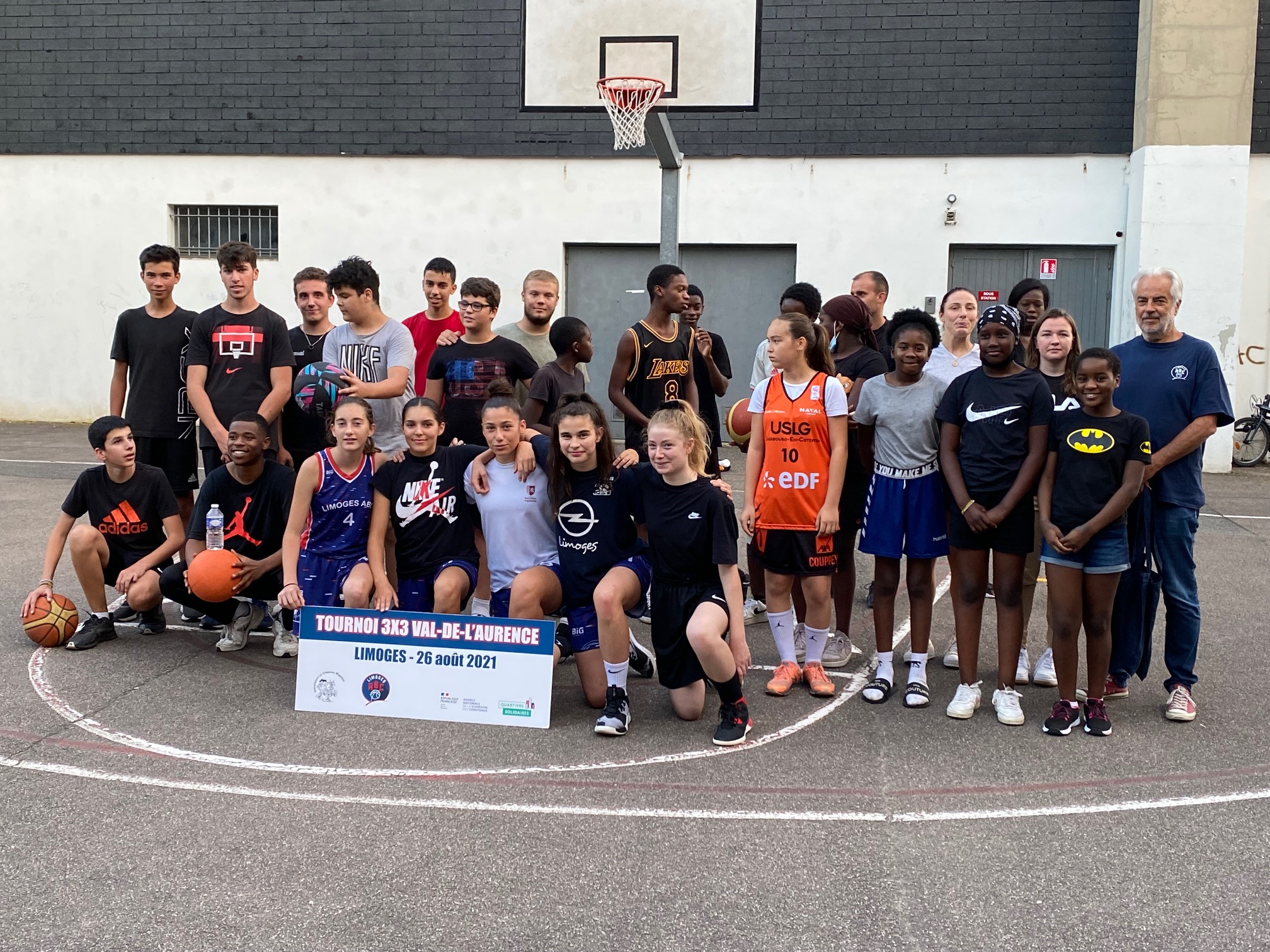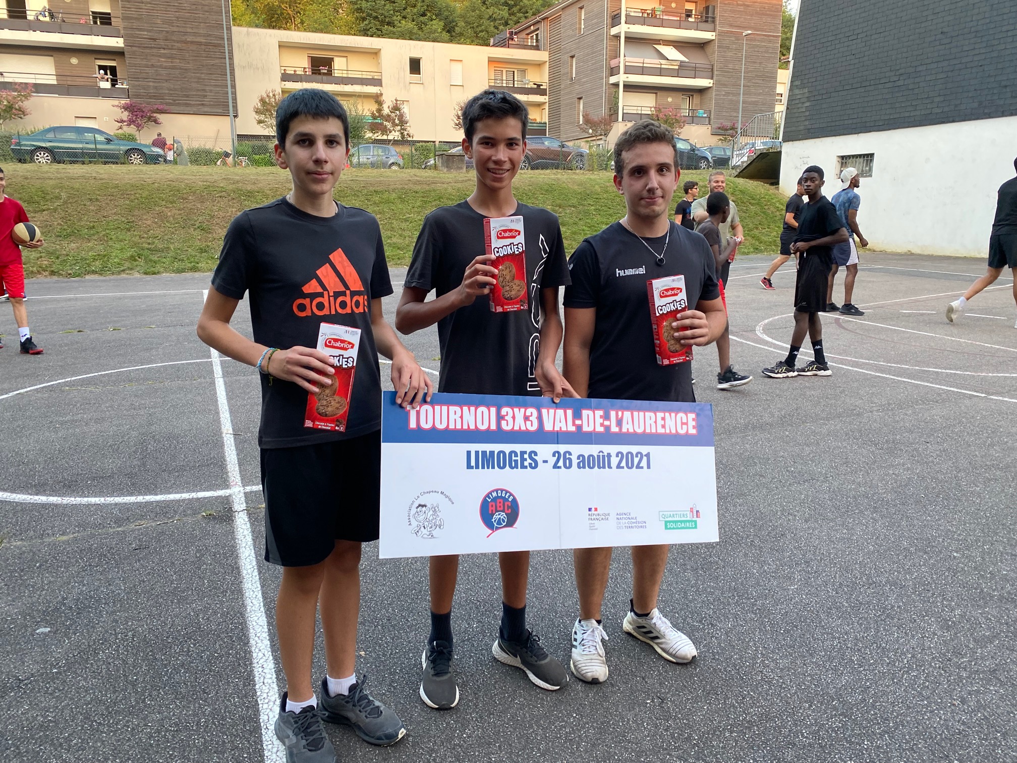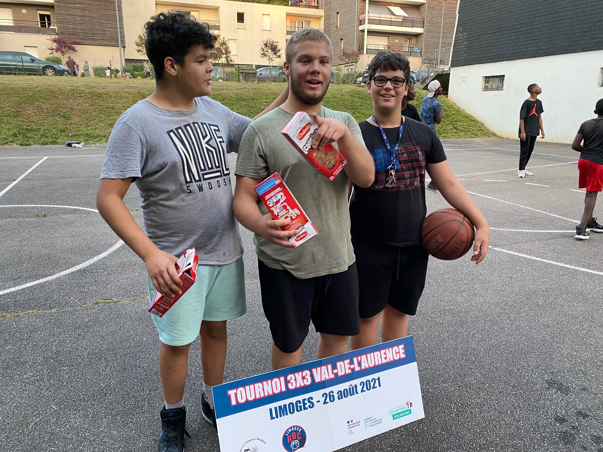 Ce jeudi 26 août, les terrains de Calmette, au Val-de-L’Aurence ont accueilli un beau petit Tournoi 3×3 dans un environnement très sympathique et convivial, musique, basket, défis, jeux, concours. Six équipes de garçons et trois équipes de filles ont répondu présentes à l’invitation du Centre Social “Le Chapeau Magique” et du Limoges ABC, en co-organisation, dans le cadre des opérations de Quartiers d’Eté, Quartiers Solidaires et des animations de rue à L’Aurence. Au total, une trentaine de jeunes de 10 à 16 ans, avec cinq équipes issues de l’Aurence (garçons), une équipe des Portes-Ferrées (filles), deux équipes du Limoges ABC (filles), une équipe constituée pour le Tournoi (garçons).