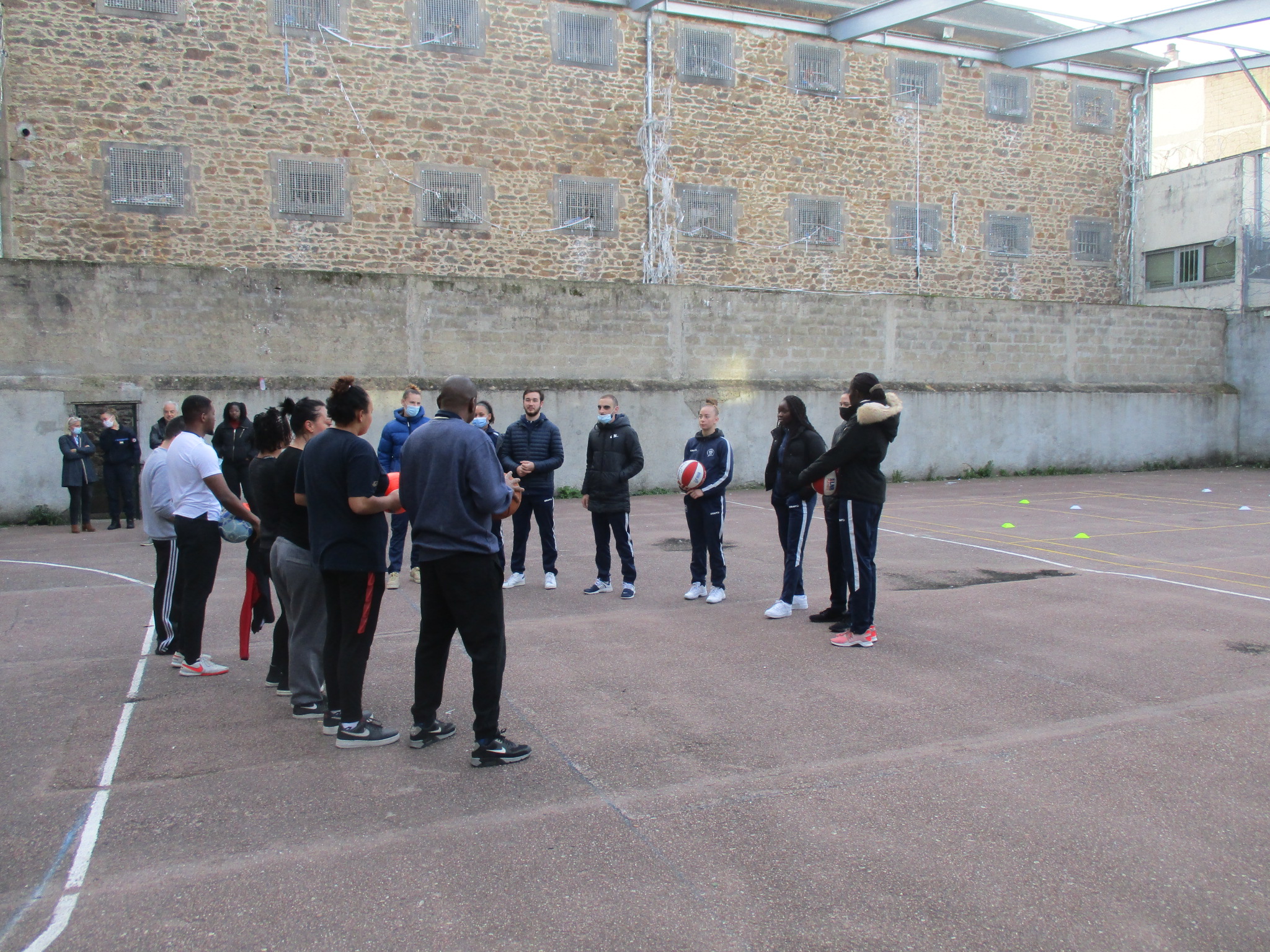 A 9 h, mercredi 13 octobre, une délégation du Limoges ABC est venue proposer une animation basket en présence de six joueuses NF1 (Danni, Khadidiatou, Kanelle, Caroline, Oumi, Hermance), des deux coaches Romain Leclaircie et Corentin Le Pan, de la responsable des partenariats Emilie Kapanza et du Président Jean-Paul Robert. Après dépôt de tous les objets personnels à l’accueil, téléphone notamment, nous sommes allés dans la cour de la Maison d’Arrêt où une dizaine de détenu(e)s femmes et hommes nous attendaient. Les coaches ont animé 1h30 de séance autour de la dextérité et du jeu avant de conclure par un match mixant les équipes, avec des détenus très participatifs. Bonne ambiance. Si le sport ou le basket peuvent apporter un moment de loisir, pensons à la réinsertion et à l’obligation de proposer des activités de ce type, sportive, culturelle, musicale, de découvertes. Pour le plaisir de tous et surtout l’utilité sociale.