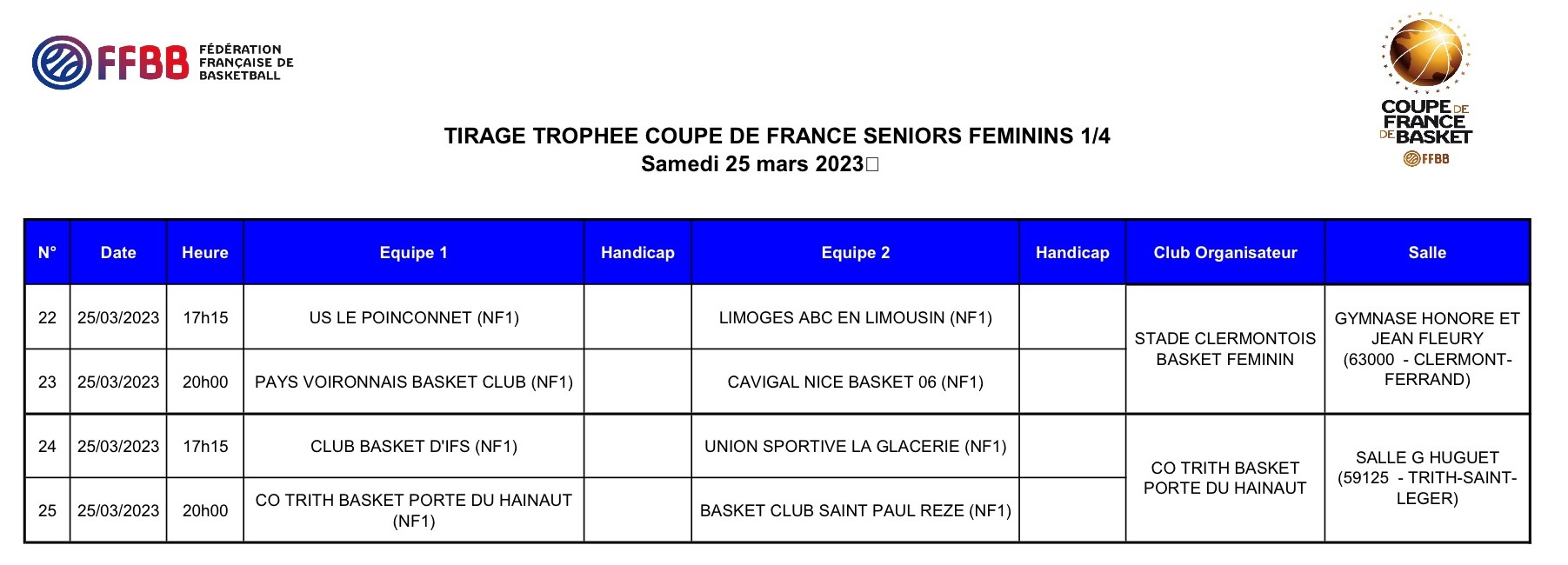 Le vainqueur dy 1/4 de Finale affrontera en effet le dimanche le vainqueur de Pays Voironnais – Cavigal Nice … autant vous dire que les deux confrontations vont valoir le déplacement à Clermont-Ferrand ! Sur l’autre plateau qui est à Trith (Nord), on voit que le club accueillant reçoit Saint-Paul-Rezé, une rencontre qui nous importera au plus haut point ! L’autre rencontre concernera deux formations de notre Poule, CB Ifs vs La Glacerie. Sachant que les deux vainqueurs de ces plateaux sont finalistes (of course) à l’Accor Arena mais qu’ils prennent aussi un second point bonus en championnat, les deux plateaux sont particulièrement intéressants.