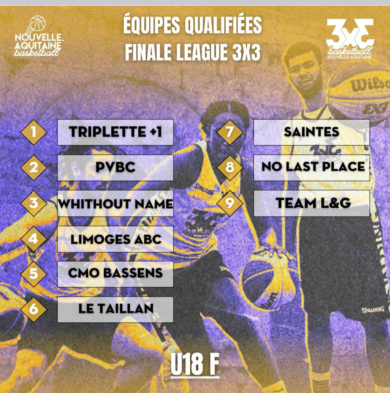 Les neuf équipes U18 Filles engagées : Without Name, No Last Place, PVBC, Triplette +1, Le Taillan Basket, Teal L&G, Saintes, CMO Bassens, Limoges ABC. Ce dimanche matin, les filles rencontraient les locales, Saintes (victoire 16-6) puis CMO Bassens (défaite 15-7). Qualifiées pour les 1/4 de Finales, nos joueuses se sont inclinées vs Pouzieux-Vouneuil (PVBC, 86) sur le core de 13-10.