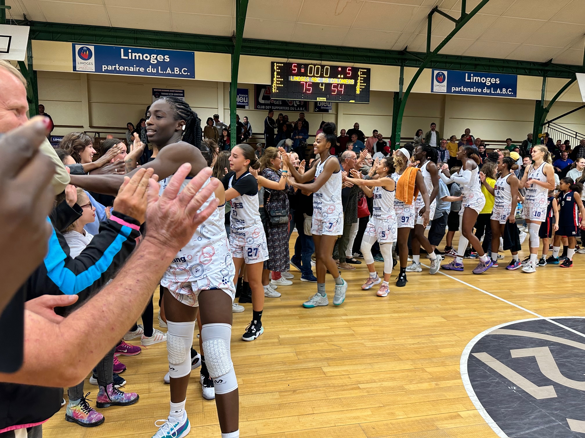 Quelle belle soirée de basket ! Une première réussie pour le Limoges ABC qui a marqué son territoire en explosant les visiteuses de Colomiers à l’issu d’un dernier quart-temps stratosphérique (27-5). Alors bien sûr, nous avons tremblé, puisque Limoges a passé trois quart-temps à courir après le score (12-14 ; 32-34 et toujours 48-49 à la 30′). Colomiers a eu une réussite insolente (8 paniers à 3 points en 1ère mi-temps) et a su jouer au chat et à la souris pendant pas mal de temps … tant et si bien que nous avions quand même quelques craintes, sauf Stella d’ailleurs (discours d’après match). C’est significatif de la confiance engrangée par les filles et par ce collectif prêt à tout. Abnégation, courage, ténacité, dureté : en un quart-temps, Limoges a remis les pendules à l’heure en passant un 27-5 qui a crucifié les columérines. Le très nombreux public (ça fait plaisir, salle quasi pleine) était ravi, les partenaires aussi, et nous de même. A samedi à IFS !