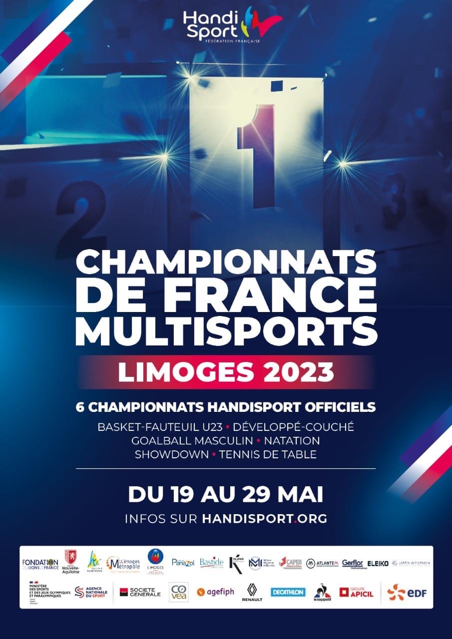 Les Championnats de France Mutualisés HANDIBASKET U23 se déroulent ce vendredi 19 et samedi 20 à Limoges (CHEOPS) et à Panazol (Gymnase Guillemot). Les autres disciplines (showdown, développé couché, Escrime DV, Goalball D1 masc) se déroulent aussi du 19 au 21 mai puis du 26 au 28 mai à Limoges. Le tennis de table et la natation handisport auront lieu du 26 au 28 mai.