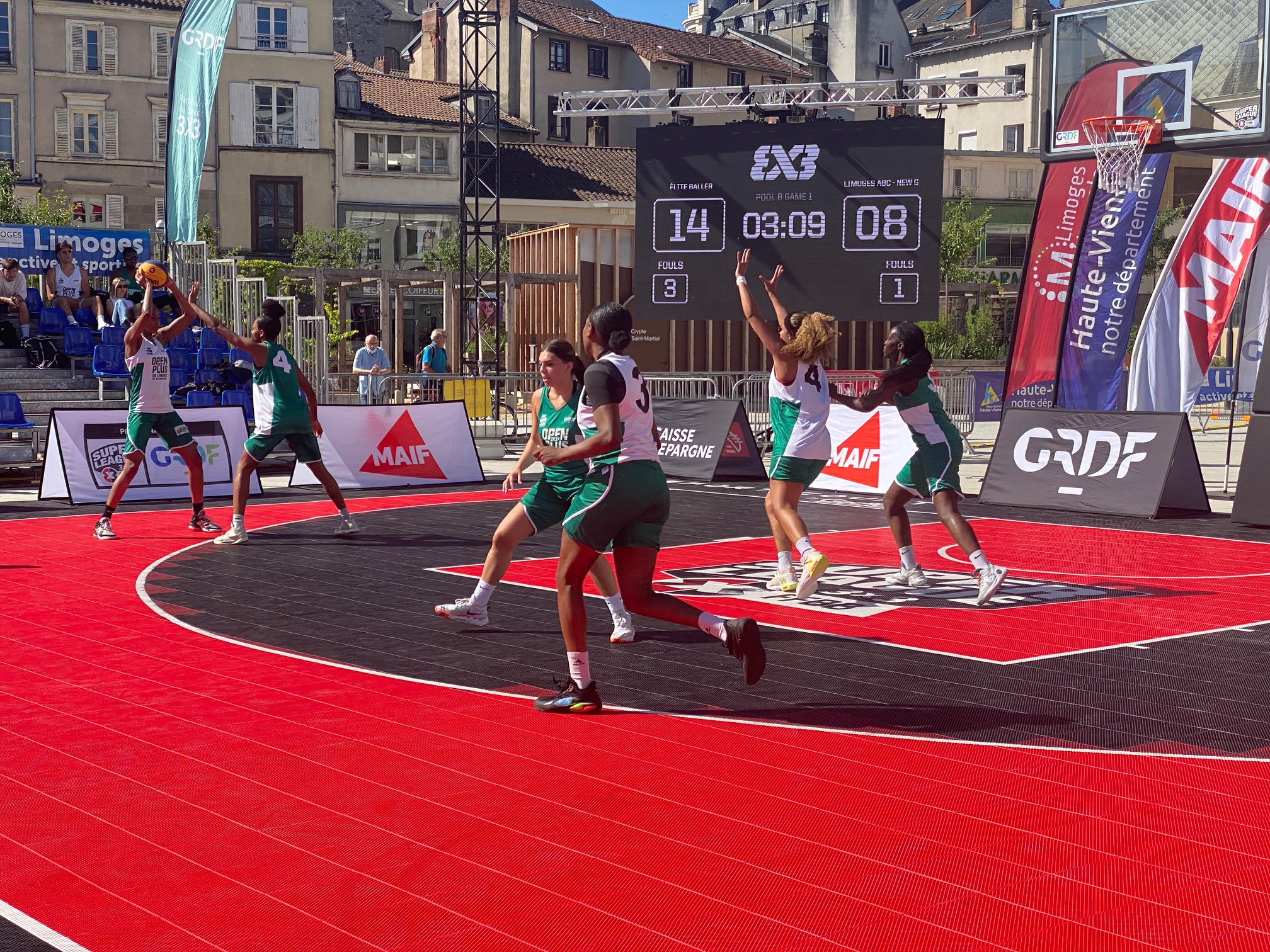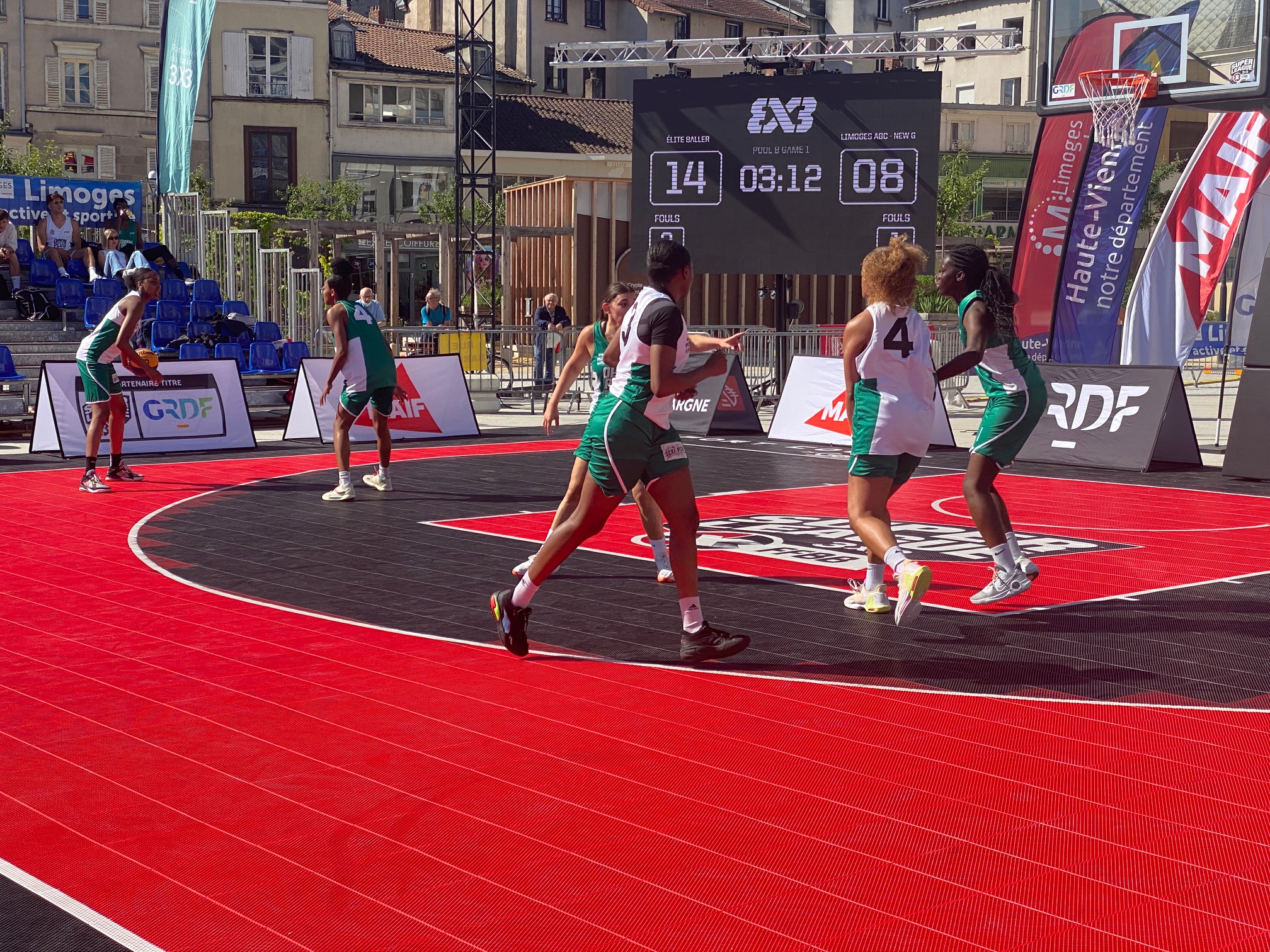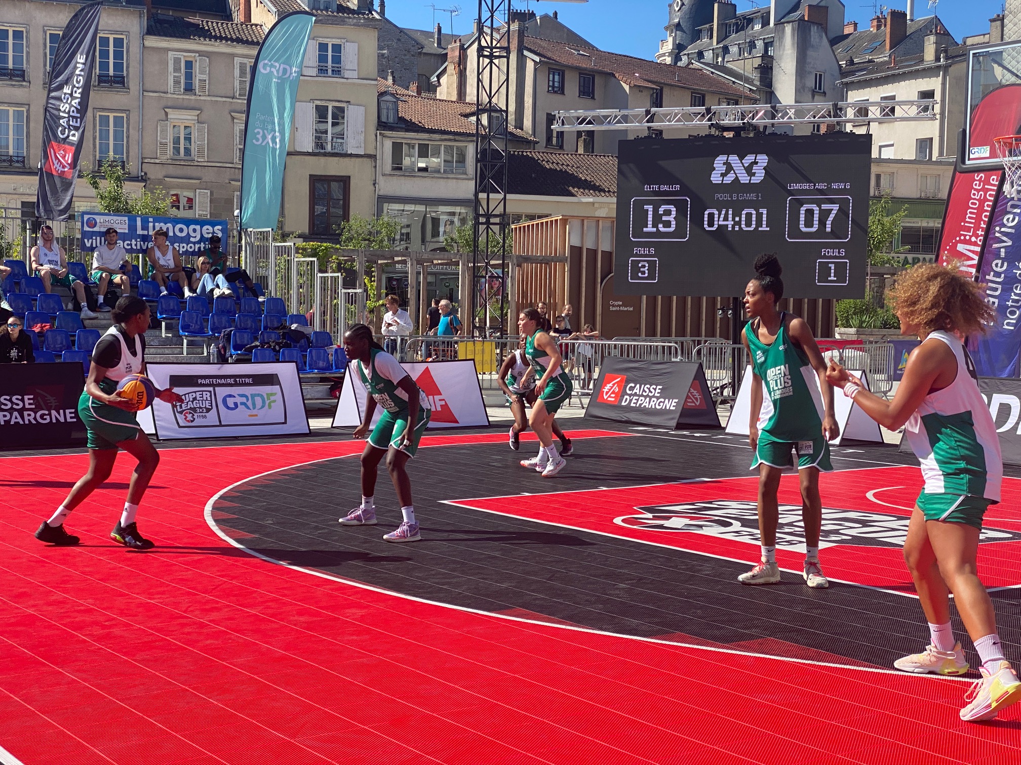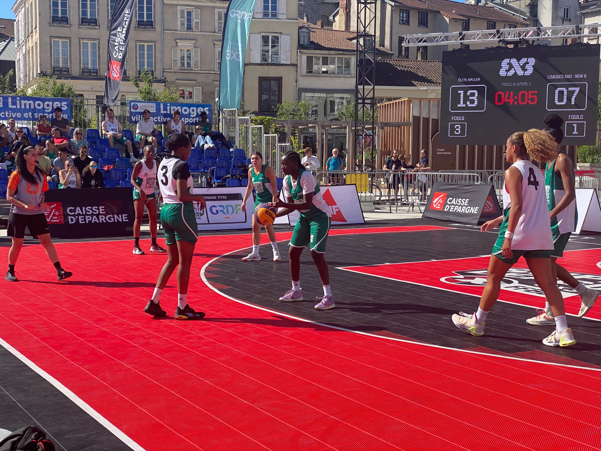 L’Open Plus 3×3 de Limoges by Intermarché, c’est parti ce samedi matin à 10h avec les phases de poules. Deux poules de trois en filles qui a vu l’équipe du LIMOGES ABC – NEW G bien se comporter avec 1 défaite contre la très forte équipe de Baller 21-12 avant de battre SPORT EVENT avec deux joueuses passées par le Limoges ABC, Amélia Moukoko et Naomie Lemongang 13-10. Deuxièmes de la poule, elles rencontreront LES GIRLS emmenées par Nelly Larraud, elle aussi ancienne joueuse du club. Rendez-vous à 16h20 Place de la République, sous un soleil de plomb.