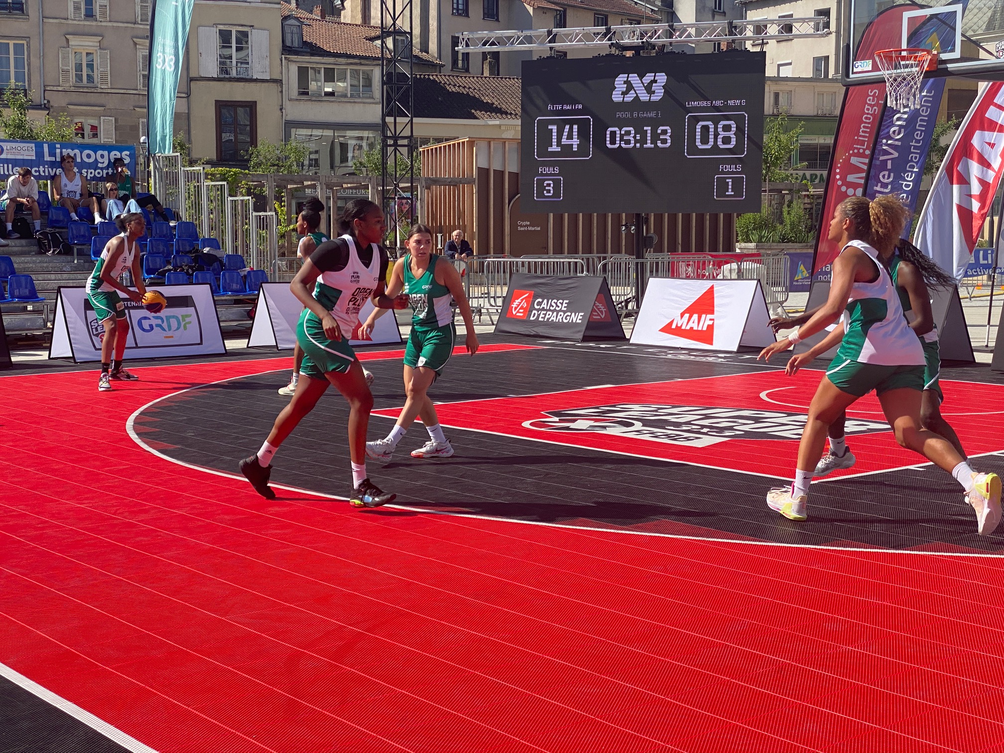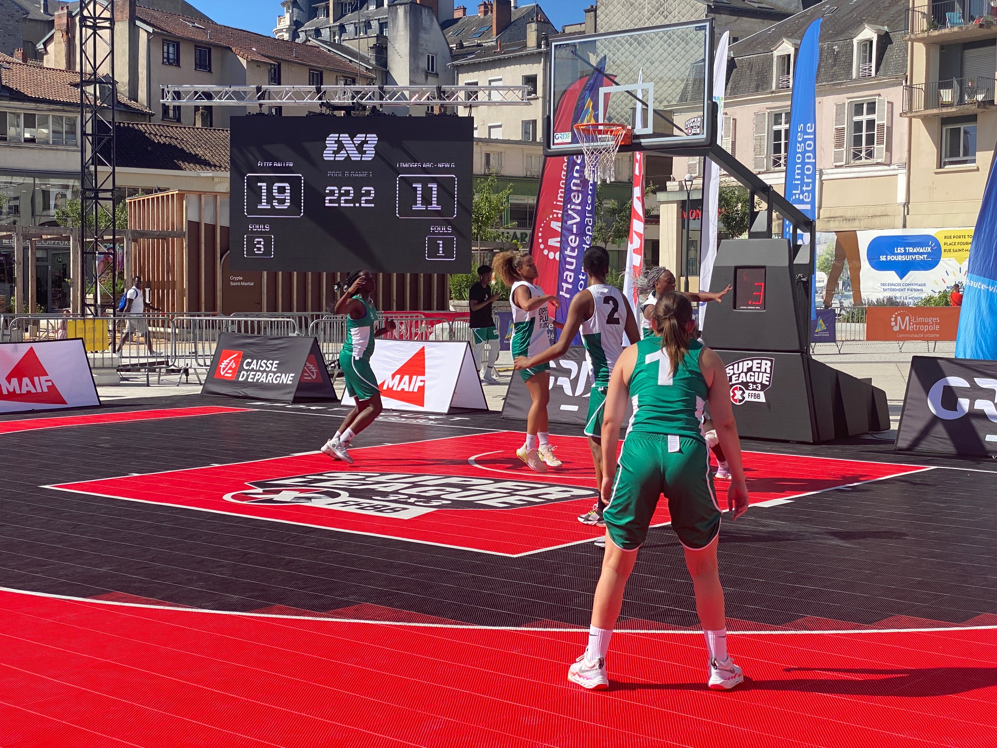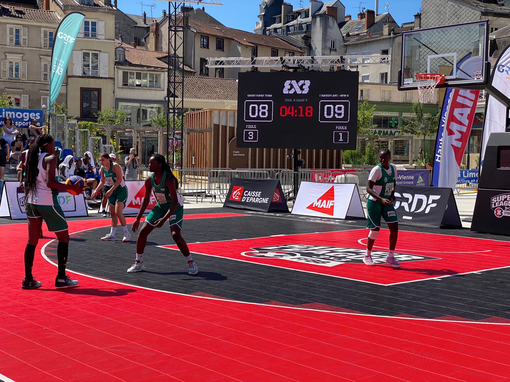 L’Open Plus 3×3 de Limoges by Intermarché, c’est parti ce samedi matin à 10h avec les phases de poules. Deux poules de trois en filles qui a vu l’équipe du LIMOGES ABC – NEW G bien se comporter avec 1 défaite contre la très forte équipe de Baller 21-12 avant de battre SPORT EVENT avec deux joueuses passées par le Limoges ABC, Amélia Moukoko et Naomie Lemongang 13-10. Deuxièmes de la poule, elles rencontreront LES GIRLS emmenées par Nelly Larraud, elle aussi ancienne joueuse du club. Rendez-vous à 16h20 Place de la République, sous un soleil de plomb.