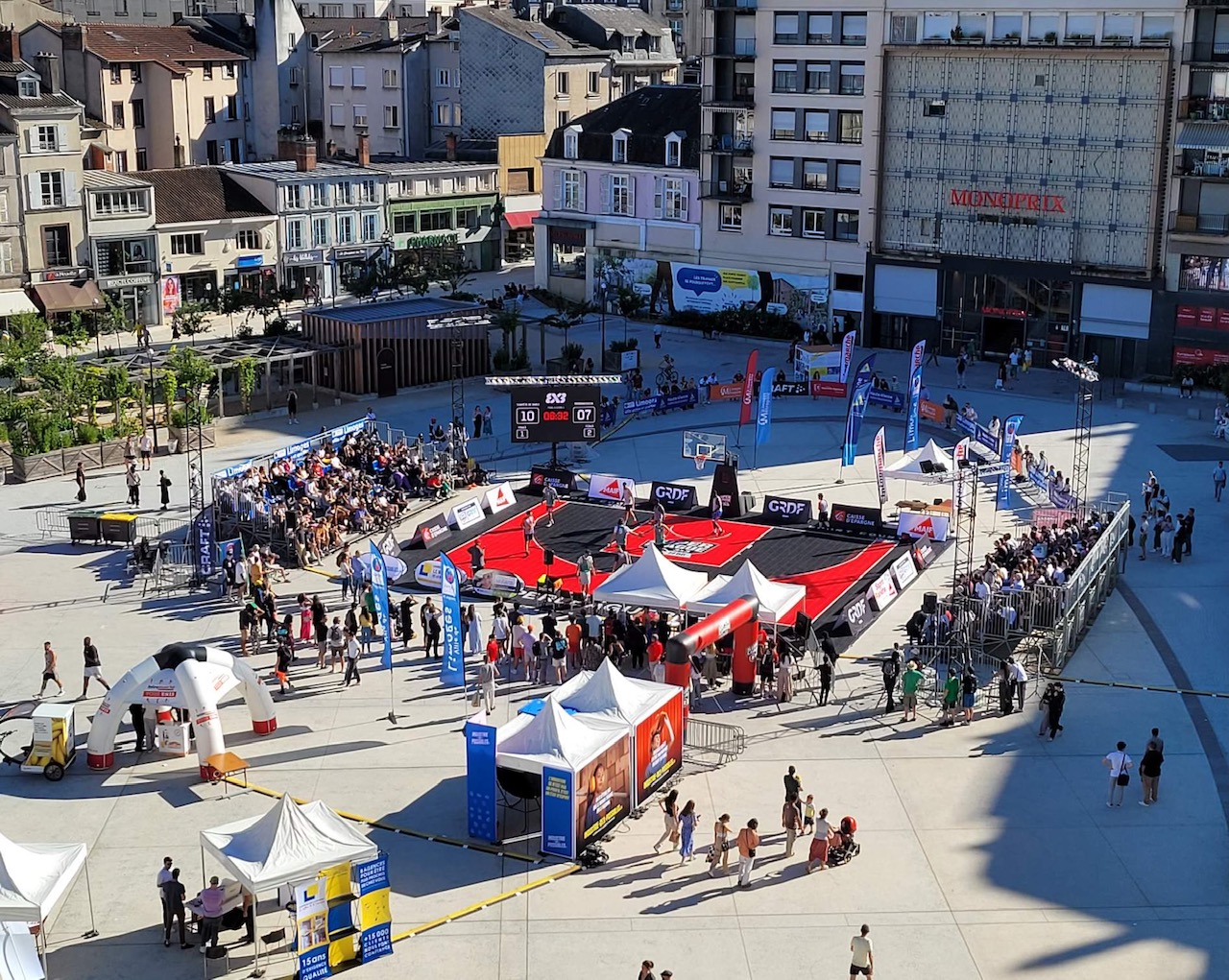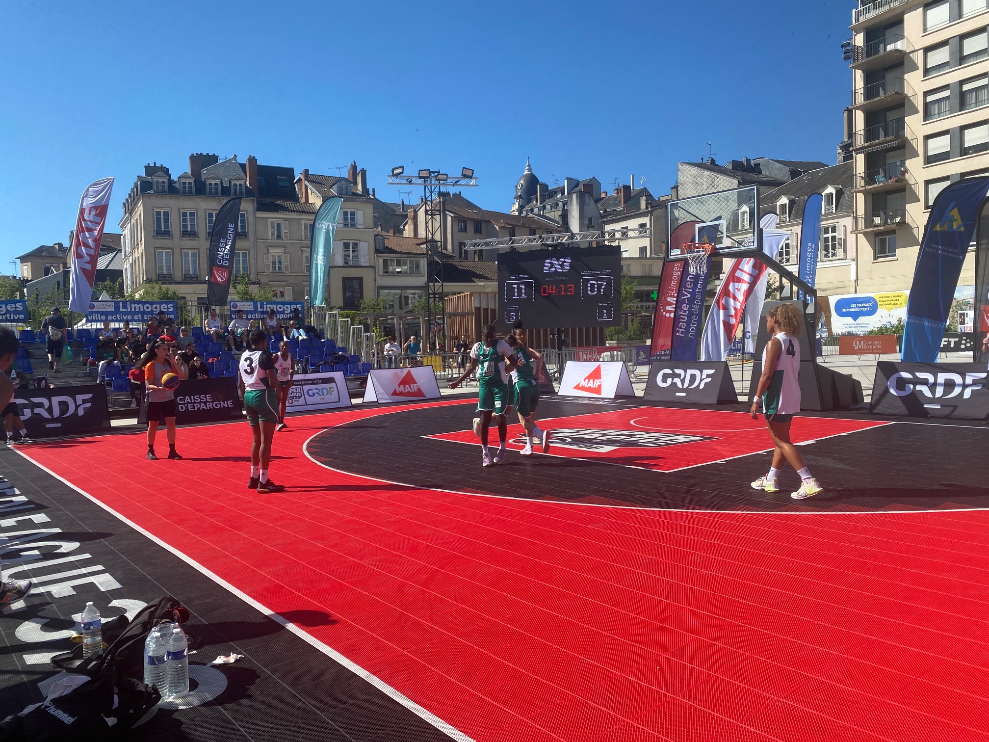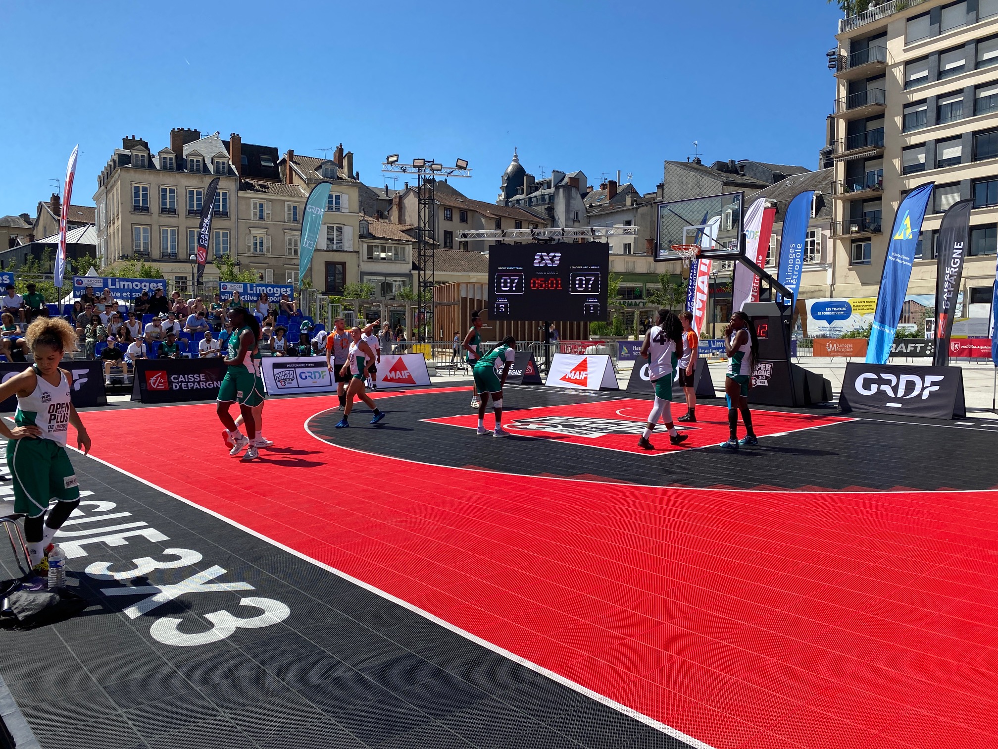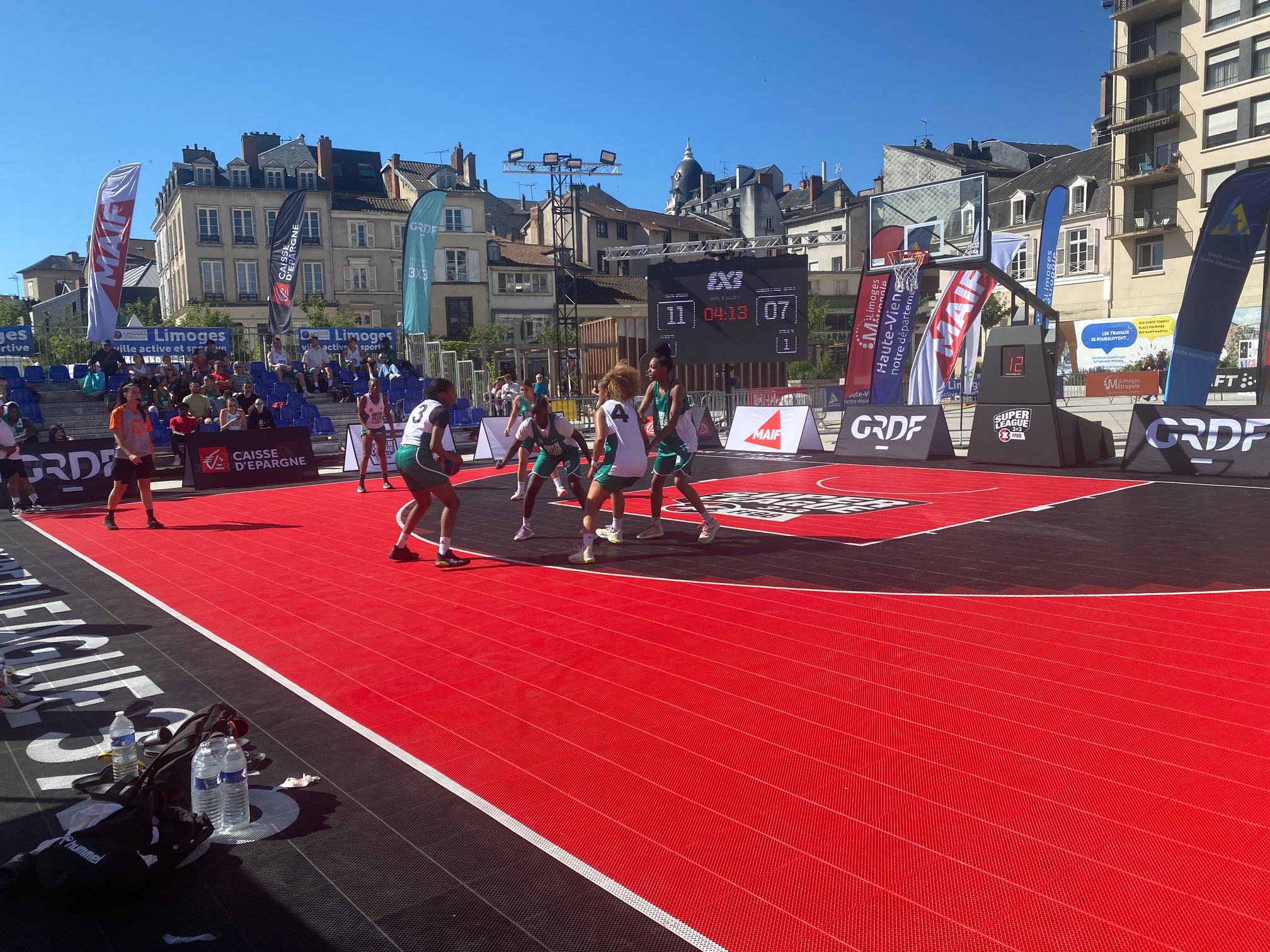 L’Open Plus 3×3 de Limoges by Intermarché, c’est parti ce samedi matin à 10h avec les phases de poules. Deux poules de trois en filles qui a vu l’équipe du LIMOGES ABC – NEW G bien se comporter avec 1 défaite contre la très forte équipe de Baller 21-12 avant de battre SPORT EVENT avec deux joueuses passées par le Limoges ABC, Amélia Moukoko et Naomie Lemongang 13-10. Deuxièmes de la poule, elles rencontreront LES GIRLS emmenées par Nelly Larraud, elle aussi ancienne joueuse du club. Rendez-vous à 16h20 Place de la République, sous un soleil de plomb.