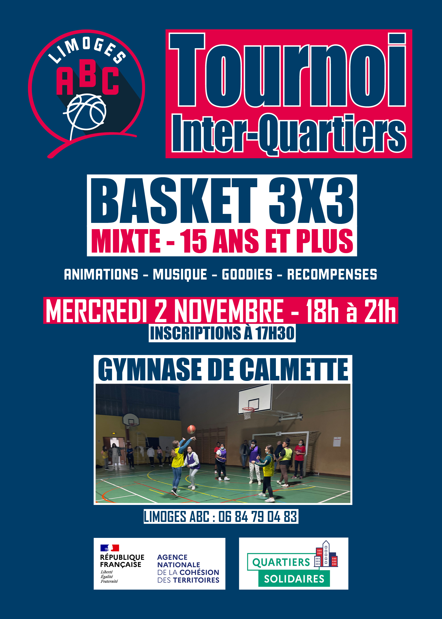 Dans le cadre de ses actions en quartiers, le Limoges ABC organise ce mercredi en fin d’après-midi un Tournoi Inter-Quartiers au Gymnase de Calmette. Ce Tournoi s’adresse à des filles et garçons âgé(e)s de 15 ans et plus. L’inscription est gratuite et se fera sur place au gymnase à compter de 17h30. Les équipes sont constituées de trois à quatre joueuses ou joueurs. Le premier objectif est de passer un bon moment de basket et de convivialité, tout en découvrant le basket 3×3. Le Tournoi est encadré par les coaches du Limoges ABC. Des joueuses professionnelles du Club seront présentes sur la deuxième partie à compter de 20h.