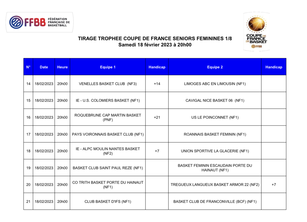 Le tirage au sort du Trophée Coupe de France (tableau ci-dessous) a ménagé quatre duels indécis entre clubs de NF1 : Colomiers vs Nice, Saint-Paul Rezé vs Escaudain, Ifs vs Franconville et un gros derby (dans l’autre poule) entre Voiron et Roanne. Le Poinçonnet hérite d’un bon tirage en allant chez le dernier club de niveau régional (Roquebrune Cap Martin) mais d’un déplacement à rallonge, plus de 900 kms et de 8h à 9h de route … Enfin, La Glacerie (en déplacement) et Trith (à domicile) vont jouer deux équipes de NF2. Rendez-vous samedi 18 février pour ces nouvelles aventures sur bitume et parquet.
